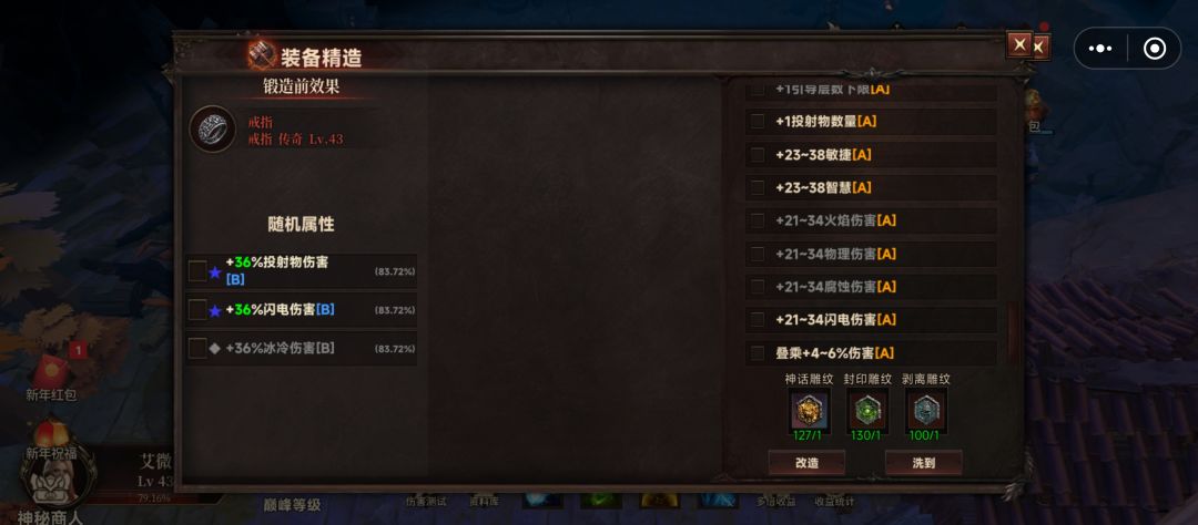70级之前不建议过多追求完美,精造很浪费材料,等级低装备更新快,只需要使用精造把随机属性洗成伤害、百分比生命词条即可,后面通过封印,剥离来打造需要的词条。
