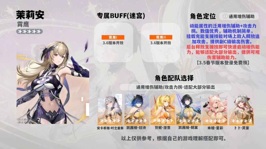 2.茉莉安宵鹰为通用辅助,辅助能力上与悠游相当,但泛用性更高!可以参与任何配队,堪称性价比之王!但要记住宵鹰和天鹅座一起上场时务必选择动能系主C否则会吃不到天鹅座的高额减抗