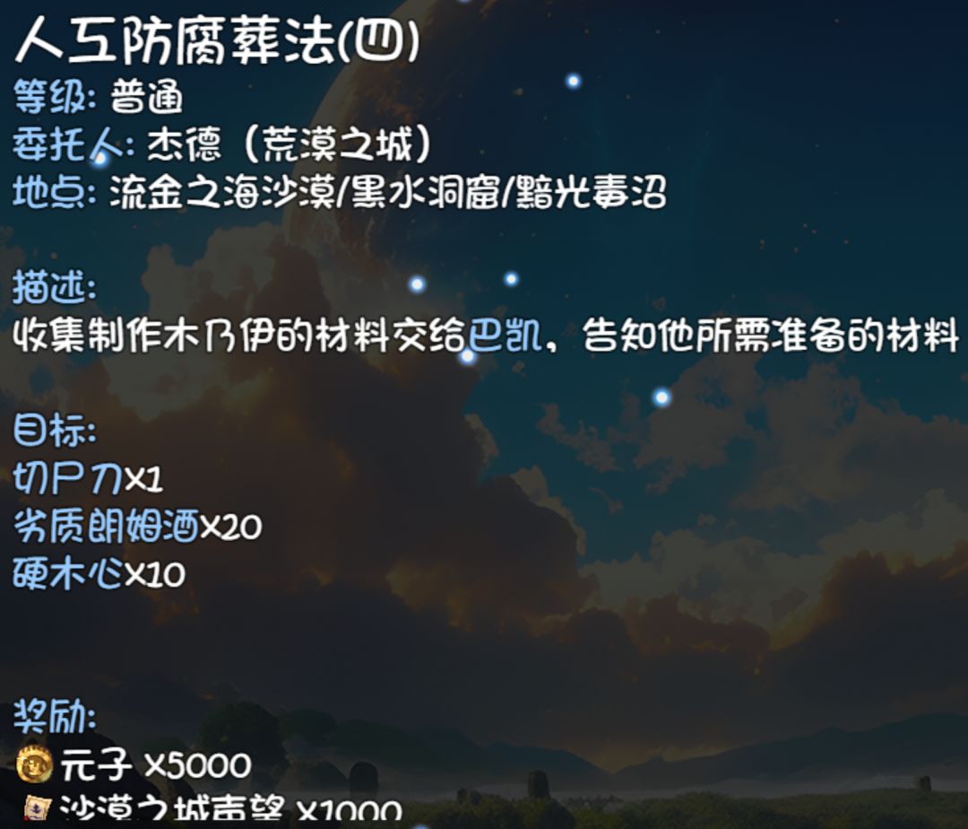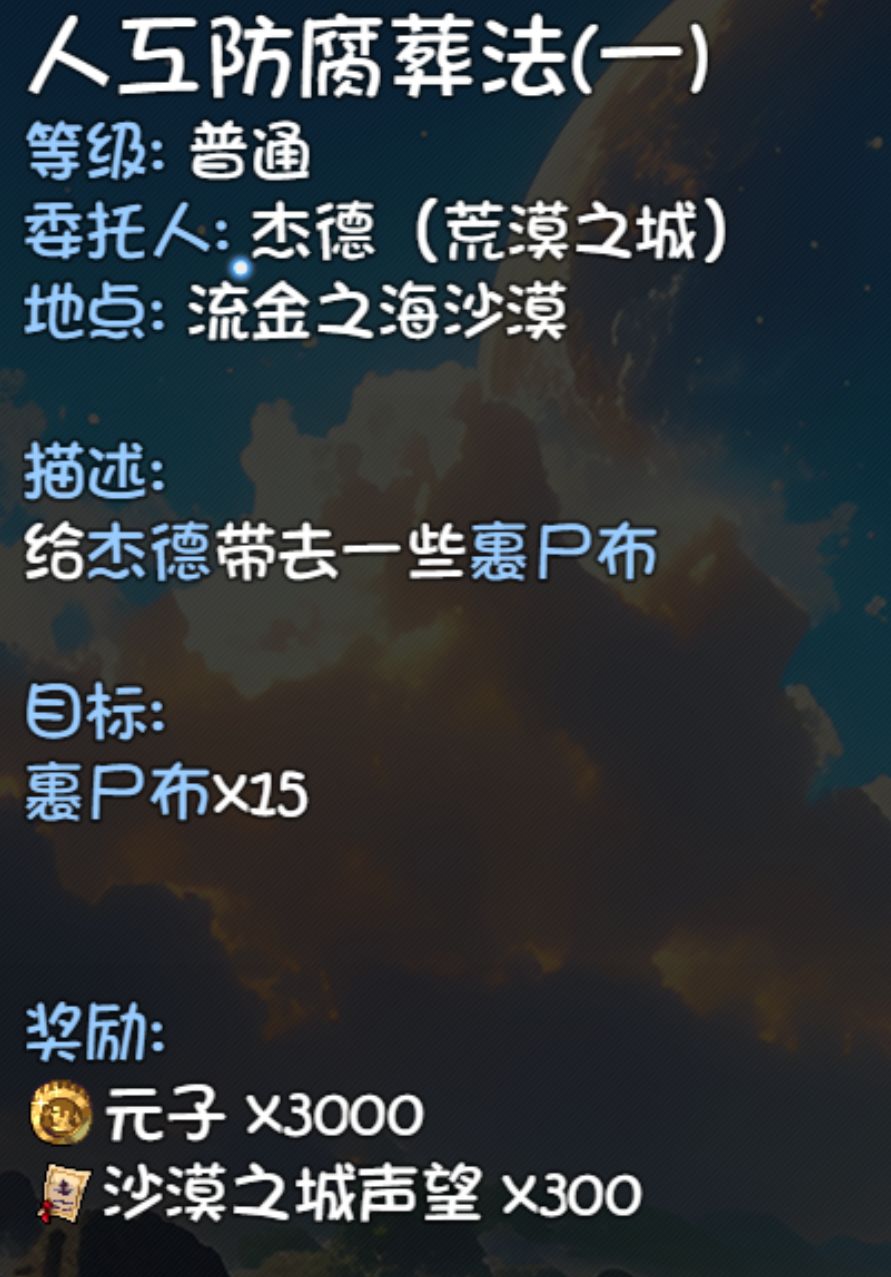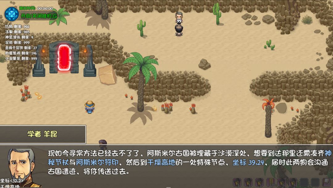 东西收集齐以后到干燥高地39,24,会直接进入,打几轮小怪和一个阿努比斯然后就可以拿宝箱了。