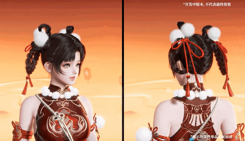 白绒小球系于发髻,麻花辫以红绳轻挽。坠着的红珠与流苏,随动作摇曳生姿。
