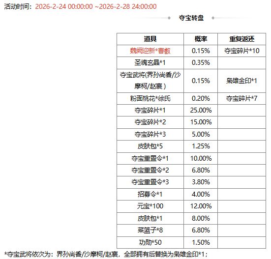 *本期上新 春福龙珠活动(SP曹操),返场 乞巧龙珠活动(谋小乔)、25夏日龙珠活动(界曹植)、岁末龙珠活动(谋孙坚),龙珠可购买时间:2026-2-24 00:15:00~2026-2-28 24:00:00;