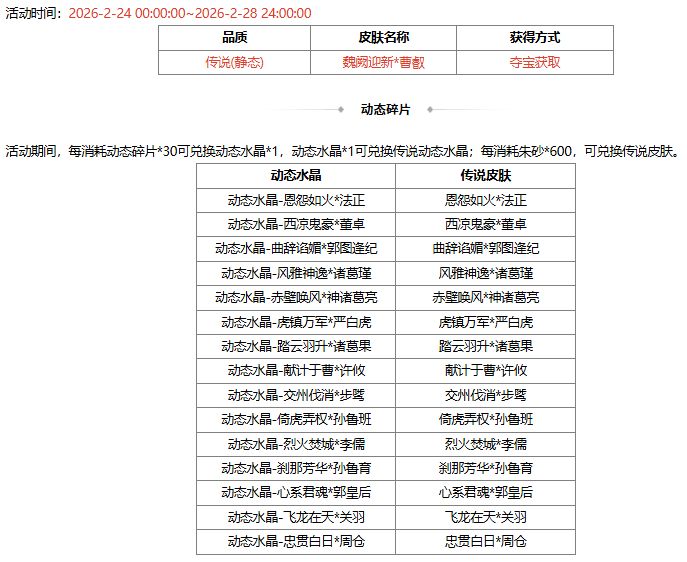 *2026-2-24 00:00:00 ~2026-2-28 24:00:00,魏阙迎新*曹叡 100夺宝碎片、粉面桃花*徐氏 70夺宝碎片 限时上架夺宝商店。2026-3-1 00:00:00 起,魏阙迎新*曹叡、粉面桃花*徐氏 下架。