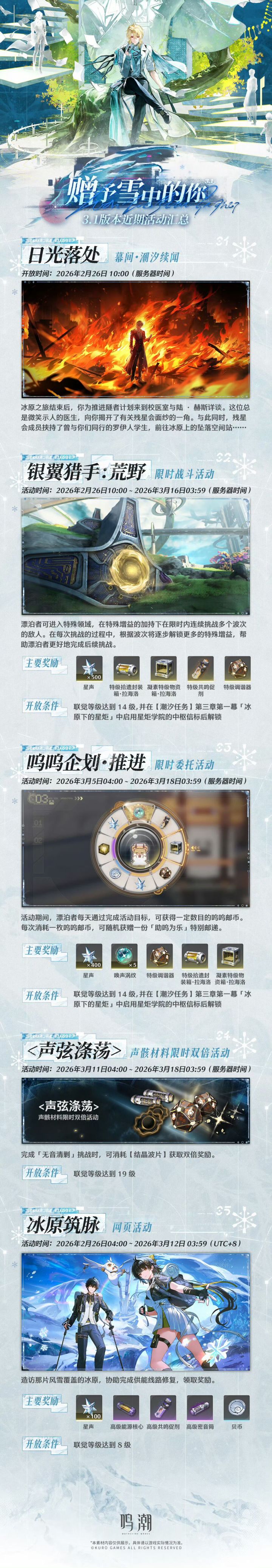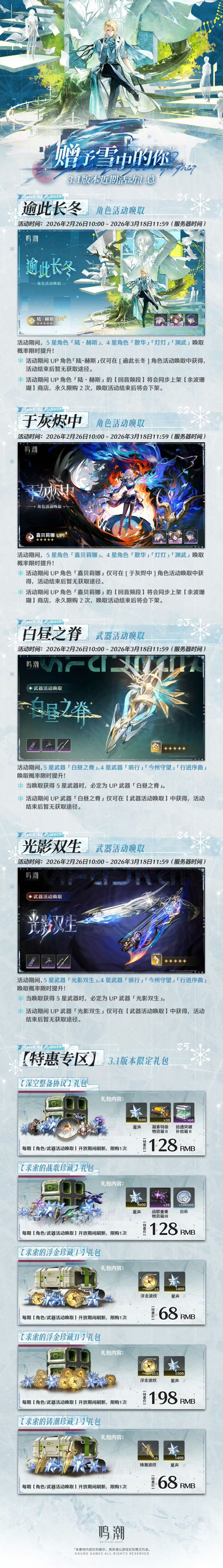 《鸣潮》3.1版本“赠予雪中的你”下半阶段将于2月26日正式开启,为漂泊者带来全新剧情、战斗挑战、角色与武器唤取活动及多重福利,官方在今天发布了近期活动汇总。