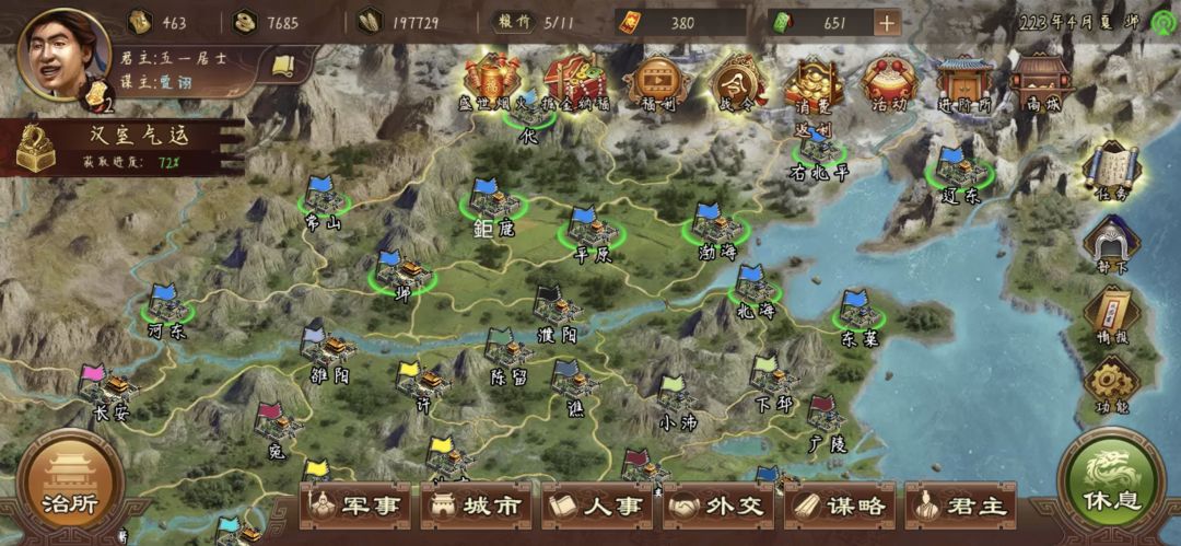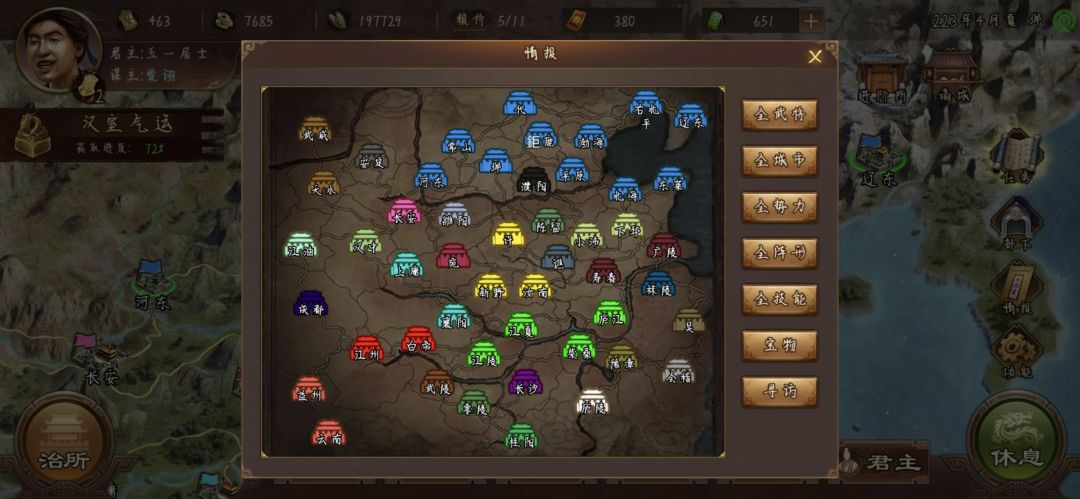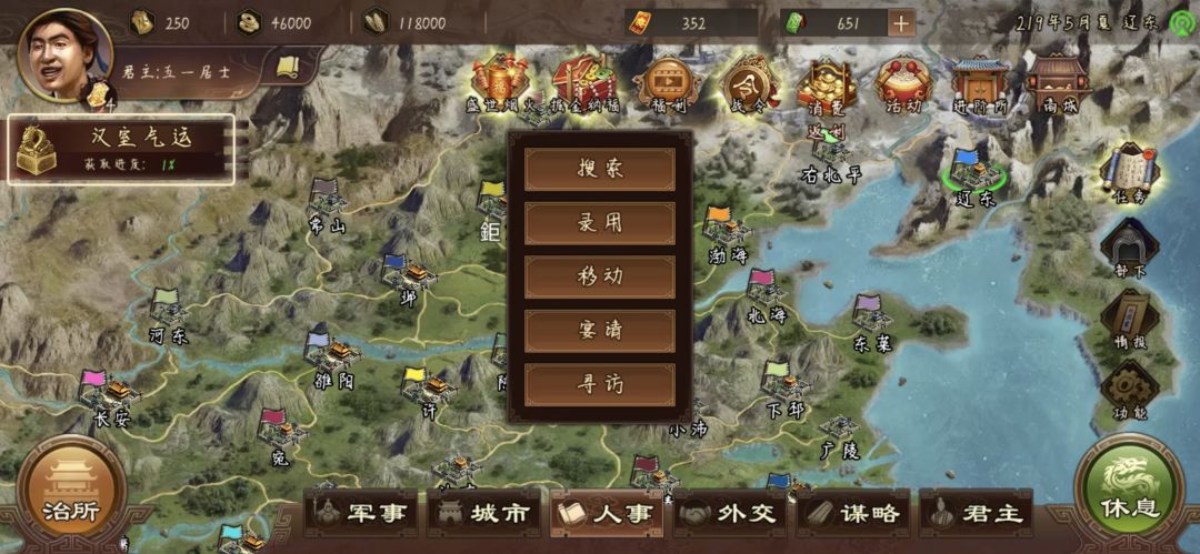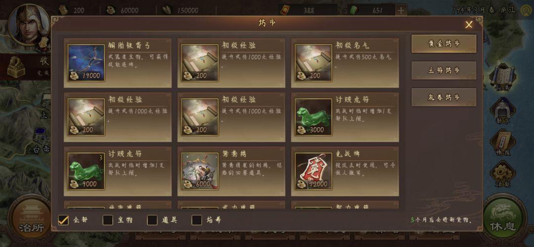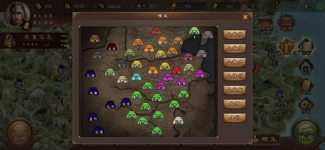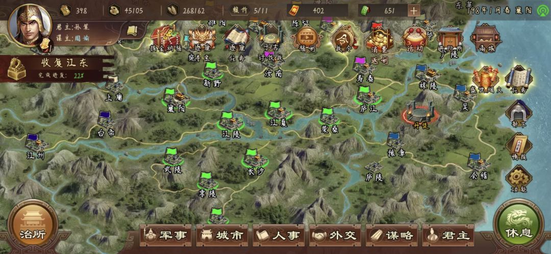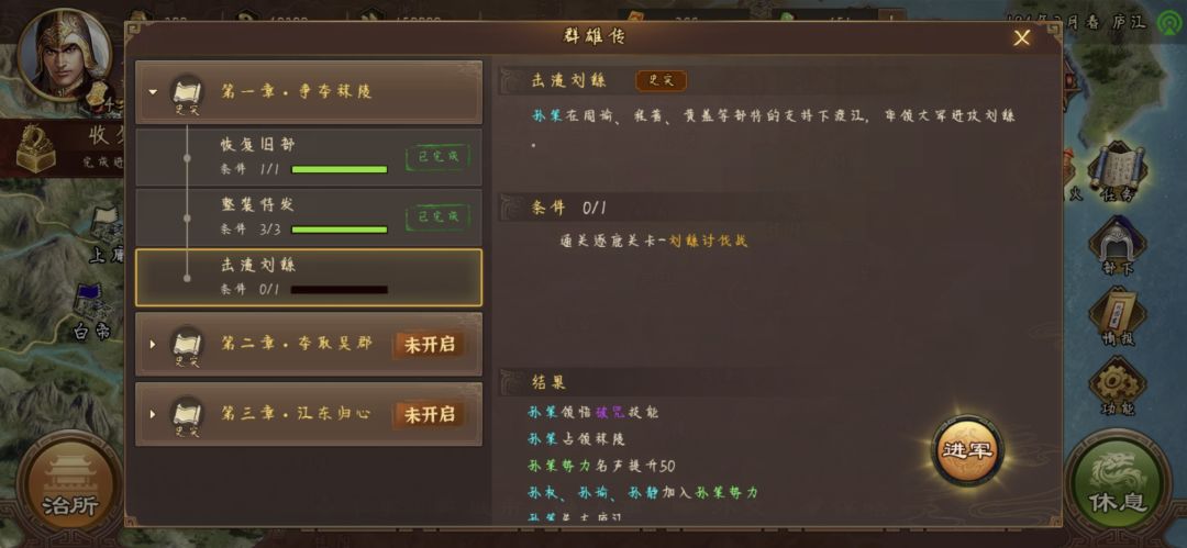 打到这里就OK了,老规矩把兵将都放襄阳,别的城仨搞内政的,过程中注意坊市中,带攻心的孙子兵法,和带疾驰的袍子还有低级名气都拿下,后面任务用