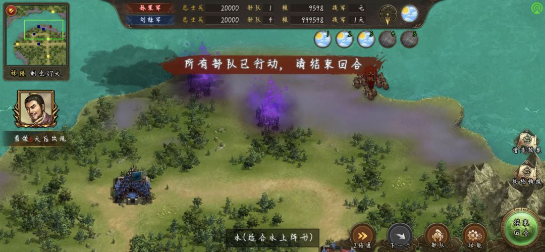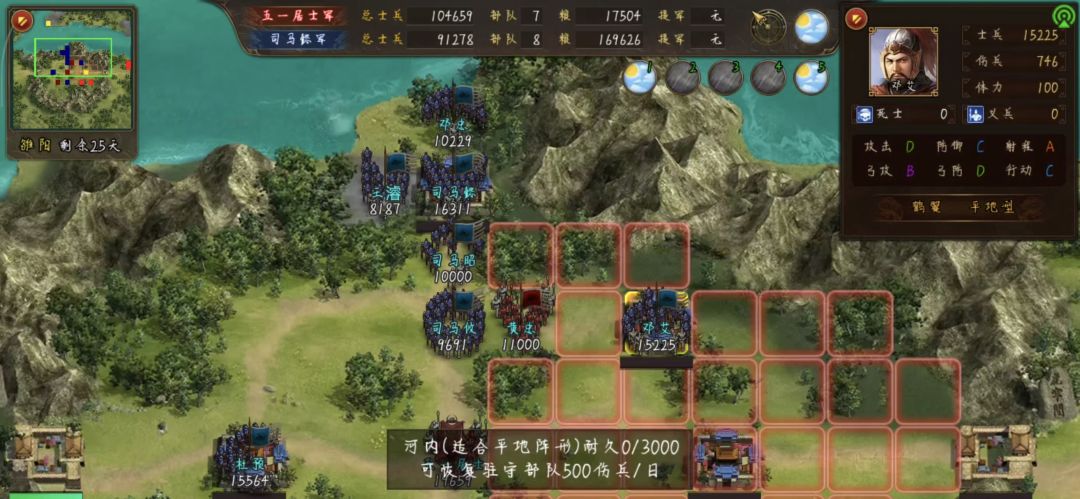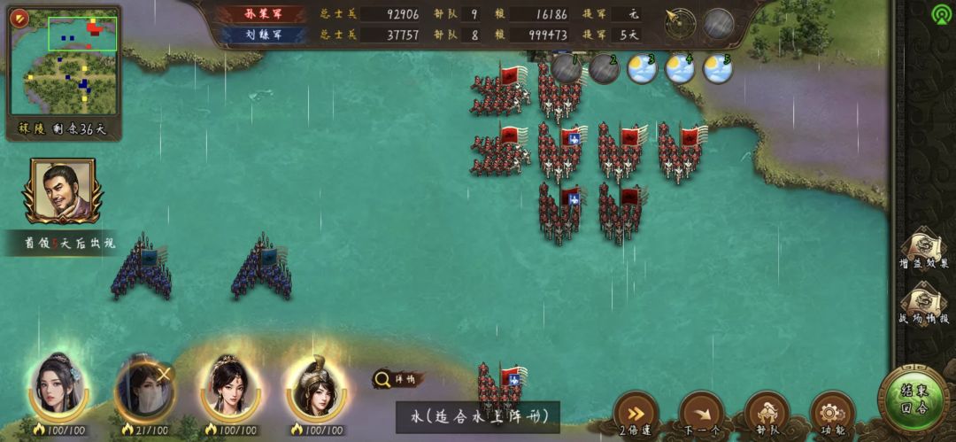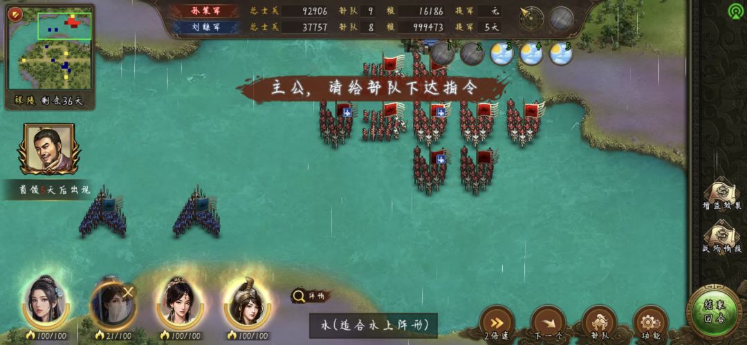 第二第三个任务吸的兵,给20000兵的水阵武将带上,还是那个位置,都过来了向后撤,来一个包围一个,注意,前三个武将靠过去不要动手,最后包围起来的将打,不然不算任务数量