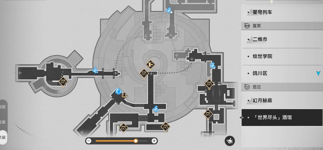 首先来到下图最左方的传送点,传送出来后顺着过道往前走,来到一处室内空间。