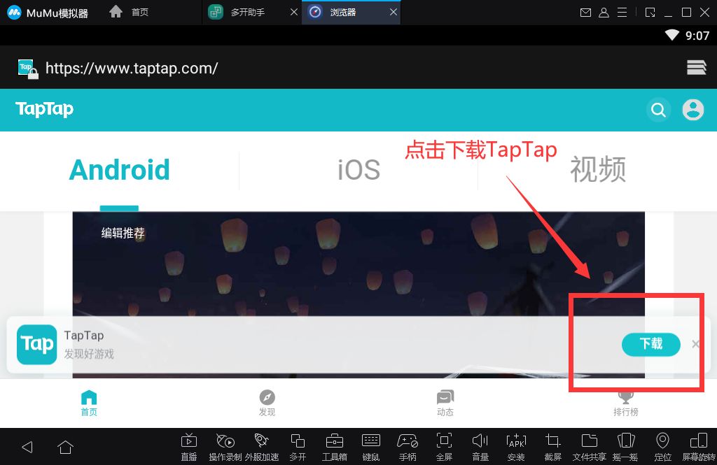 1.打开MUMU模拟器的浏览器下载TapTap
