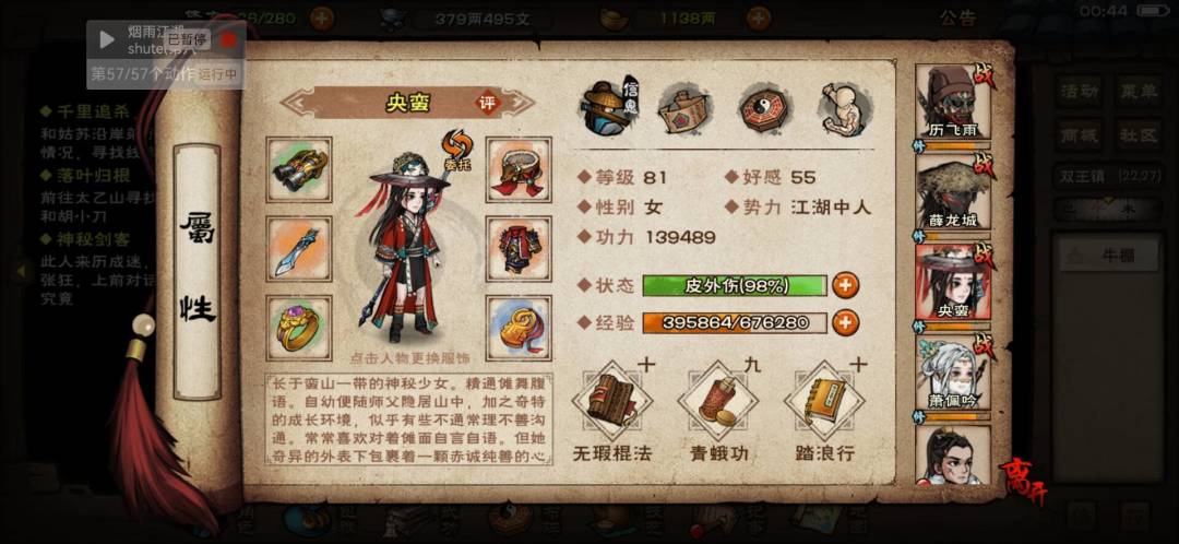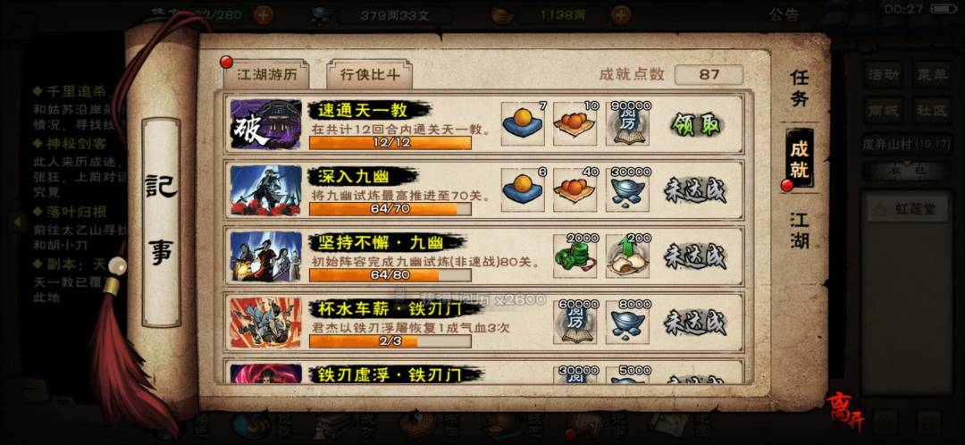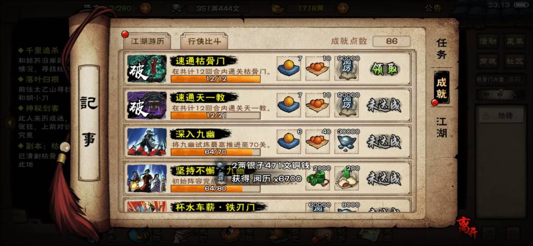 小米折扣号目前氪金350➕30一共380,进度天一枯骨只弹攻击琴都12回合速刷了,已经90级不过央才81,还有2天央青娥10重感觉可以去试试目前39天。