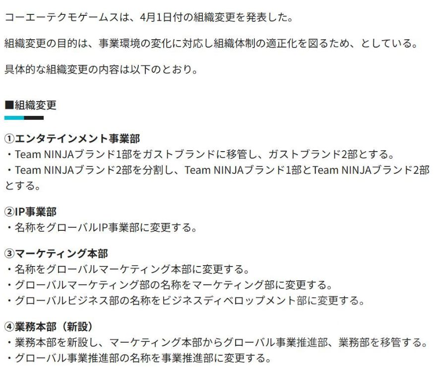 光荣特库摩宣布重组:Team NINJA与Gust迎来重大变动