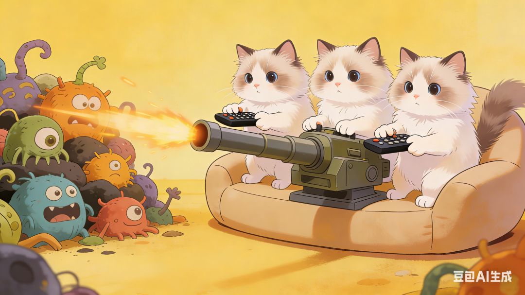 我盯着左边:三只布偶猫踩着懒人沙发,爪爪按着遥控器,炮口懒洋洋对准怪堆。“喵~炮弹已耗尽,等朕睡醒再填装~”话音刚落,一只史莱姆从炮口底下大摇大摆溜过去……这精准度比老板画的饼还虚啊!但耳机里突然炸开弹幕:“选猫!你看那只橘猫屁股底下压着SSR级限定时装!”(真的假的?)