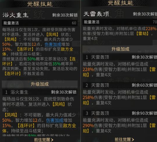 其觉醒技【浴火重生】则堪称战术核心:当庞统受到致命伤害时,他将复活并获得智力与伤害提升,同时有50%概率对全体敌人施加一次【连环计】,若成功发动则降低35%概率并再次发动,直至发动失败。