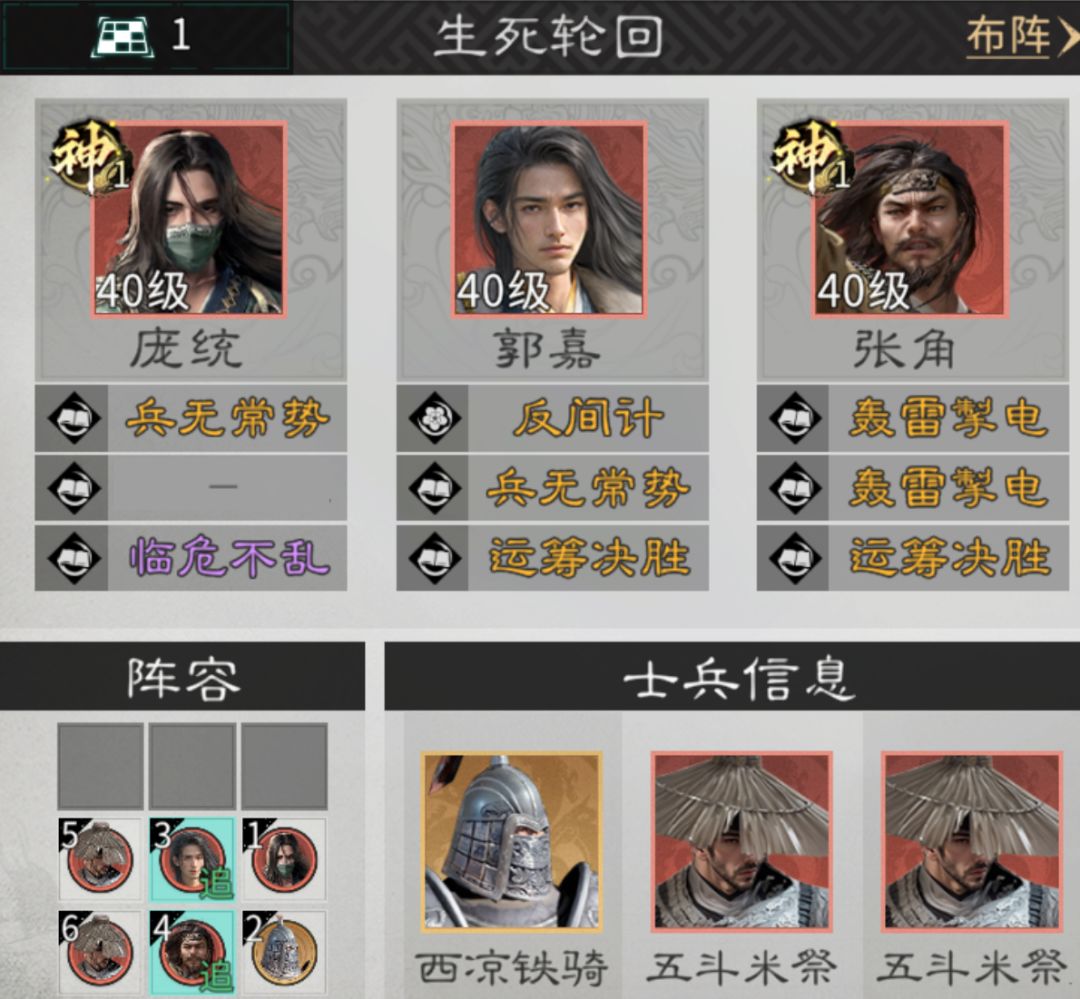兵种站位:在庞统的下方放置一个西凉铁骑,在郭嘉和张角身后各放置一个五斗米祭。