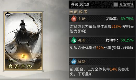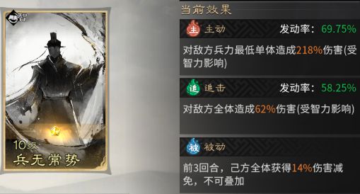 主动技能固定携带【兵无常势】,该技能可对敌方兵力最低的单体造成高额伤害,能精准实现战场收割与残血清除。