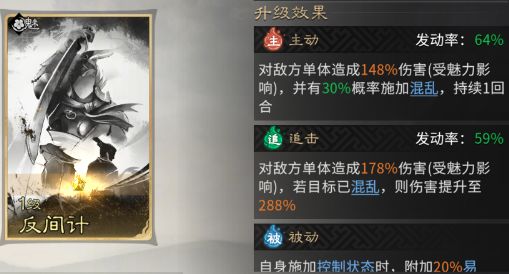 主动技能固定携带【反间计】,在造成伤害的同时,有概率为目标施加【混乱】状态,能够有效干扰并打乱敌方的行动节奏。