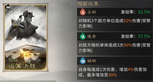 被动技能固定携带【运筹决胜】,可直接提供伤害加成。由于郭嘉的追击技能为全体AOE,其天赋【十胜十败】同样也是全体伤害技能,可快速叠满【运筹决胜】的增益层数,从而稳定获得最高40%的伤害加成。