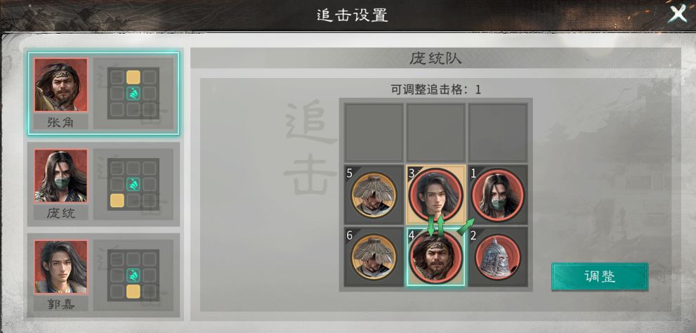 英雄站位:庞统不站追击格,张角站庞统追击格,并与郭嘉互站追击格。