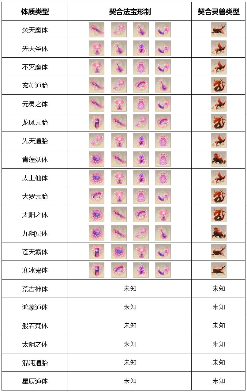 目前20种体质我只收集到14种,还有6种未收集到,每种体质与4种法宝和1种灵兽可完美契合,具体的14种体质与法宝和灵兽的契合关系我放图片里了,剩余6种欢迎大家补充~~~
