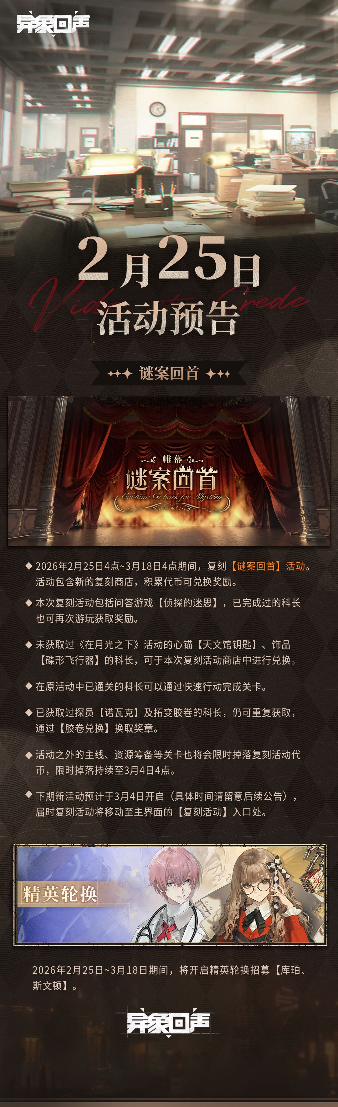 2026年2月25日4点~3月18日4点期间,开启【谜案回首】复刻活动。