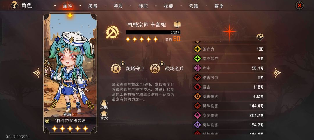爆伤较低,但也能用了,实战个人感觉命中溢出。攻击特质记得改成鲁莽,加48爆伤
