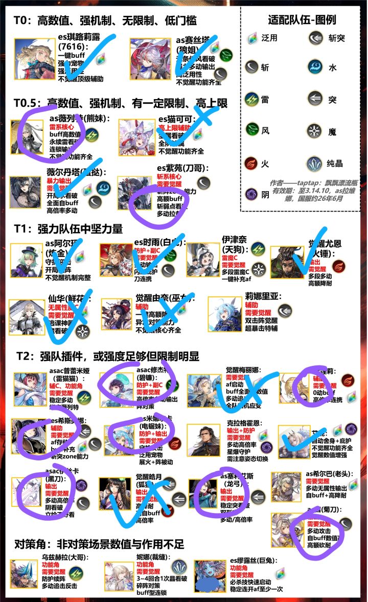 强度榜在p1。蓝勾是有的;蓝色勾点是需要觉醒但没觉醒的(仙华已经觉醒了是我手误);紫色圈圈是没有对应形态但有本体的。今天遇到的这个地牢诗人应该选哪个角色优先肝呢?