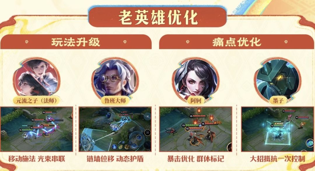 元流法师优化施法手感、鲁班大师拓展位移玩法、阿轲降低操作门槛、墨子补足生存短板,所有改动均为正向增强。