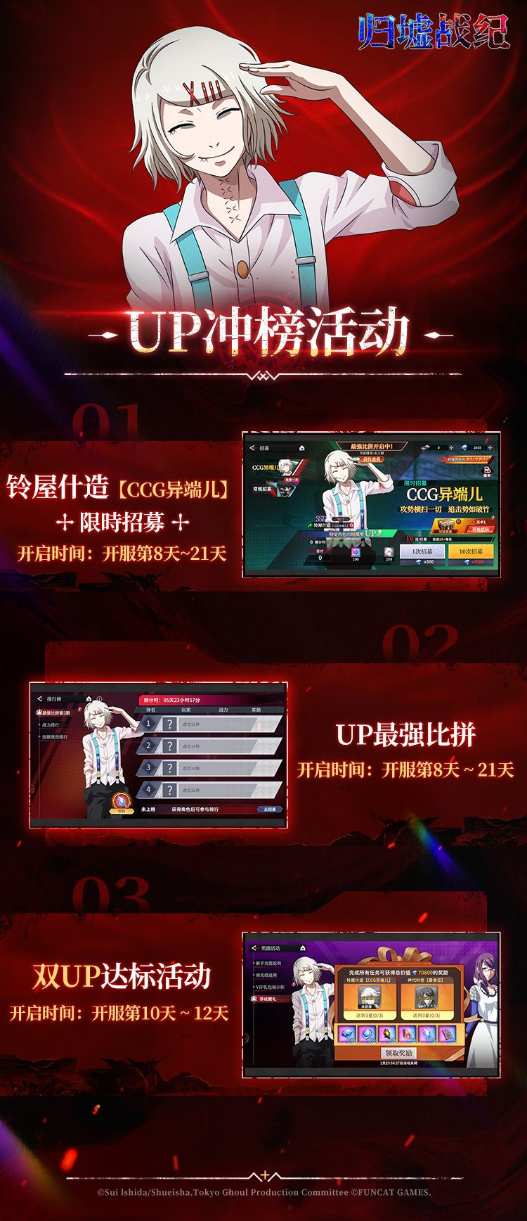 升级特定角色,参与UP最强比拼,领丰厚游戏奖励,还有铃屋什造【CCG异端儿】神代利世【暴食狂】双UP达标活动,等你来参与!
