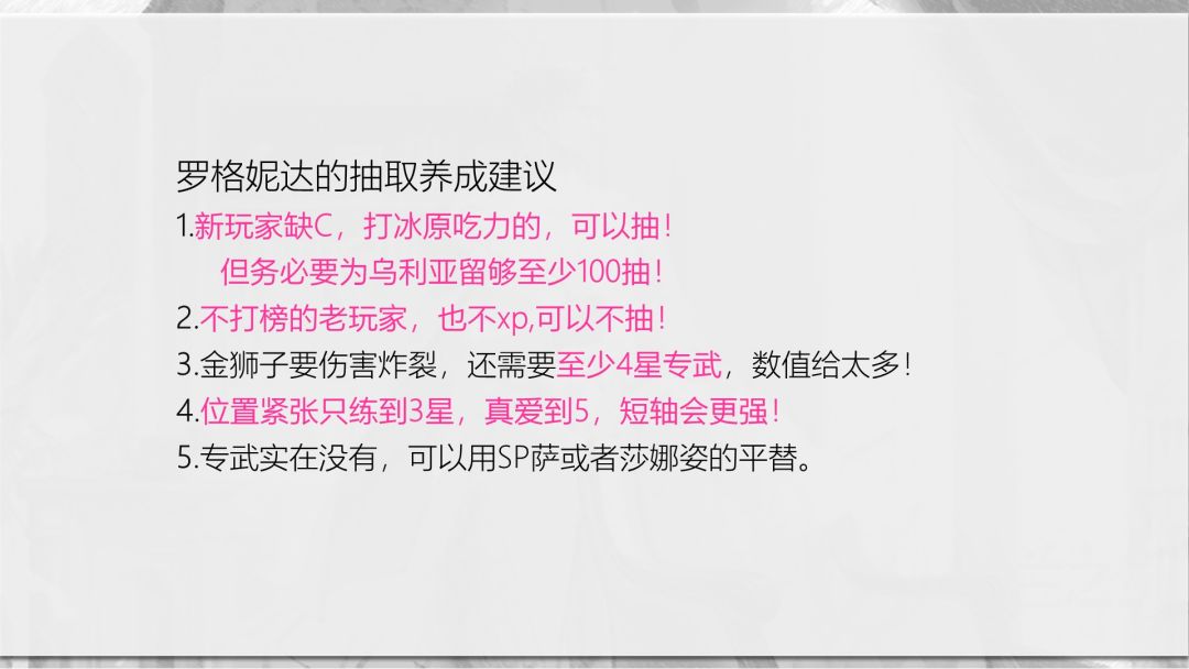 最后的抽取和养成建议:如果你是新玩家,跑片也有位置,可以抽一个。但务必要为后续的乌利亚留够至少100抽,切记!而对于不打榜的老玩家,也不戳XP的,可以不抽。同时,金狮子要伤害炸裂,你还得配个4星专武,毕竟数值给的多。这个卡在的确可以在版本内,配合高练的安娜和熊,让试炼这样的高难关难度适当降低,但如果你练度不够,没有趁手的装备,那可能体感不会有太大的变化。