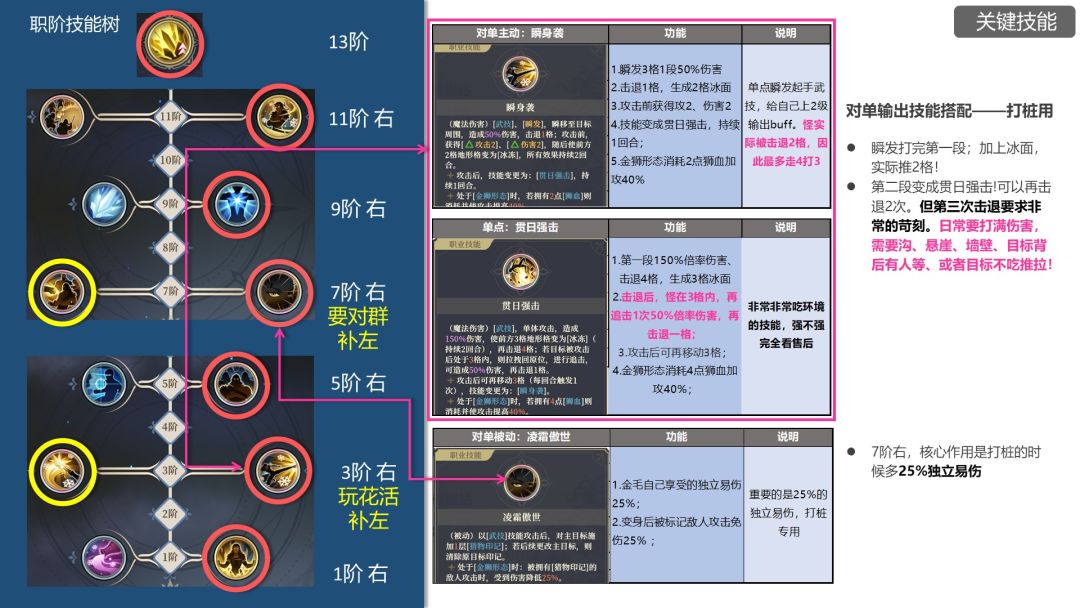 接着我们看技能。金狮子核心输出技能就是3阶右的瞬身袭,三格选取,三段攻击,每段都带击退,倍率总共250%。每段击退都附带冰面,实际会推开更远的距离,这就导致经常伤害打不满!日常要打满伤害,必须目标背后有沟、悬崖、墙壁、物品、人,或者压根不吃推拉,导致推不远,才能打满伤害,就很奇葩。这里的技巧就在于,最多走4格打3格,否则会打完第一段,第二段都摸不到人。打完瞬身袭,技能变成高倍率的贯日强击,伤害主要靠第二段,推最远也是第二段,能推4格,加上冰面,实际是6格!打完后可以再移动3格保命。变身后,两段技能,第一段费两点狮血,加攻40%,第二段费血4点,加攻40%,总计6点。