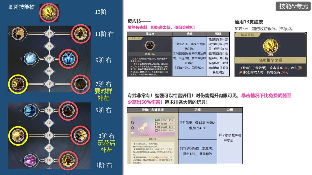 然后被各种吐槽的反应技,给了先制,但无法打断!伤害较低,退后2格却还是要挨揍!在高压关,容易暴毙!而通用十三觉醒技,加攻击5%,但只对健康敌人加伤!收益不高,不管虐菜还是站桩,收益都很低。