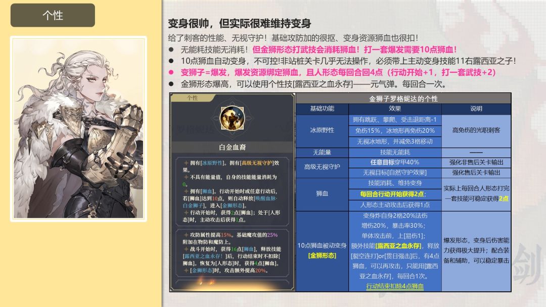 金狮子的个性,除了版本角色都有的高级无视守护,还给了一系列刺客的特点,整合到了冰原野性里面,如跳跃和攀爬、无视冰冻地形。同时拥有和女帝露卡玛尔一样的,无能量和技能无能耗的特点。独有变身资源狮血,满十点就会自动变身超级塞亚人白金狮子,但变身后会高速消耗狮血!金狮子很帅很炸裂,附带20%加伤和30%暴击,金狮形态很容易满爆!同时,金狮形态能使用大招[露西亚之血永存],也就是元气弹!但每回合仅一次。