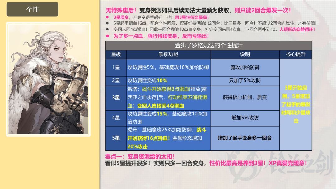 个升星方面,主要提升金狮子起手狮血点数。3星后,起手8血,行动开始2血,可以战斗开始就变身,变回人回复4点狮血;至此,金狮输出轴就可以正常循环,实现人狮交替,每两回合变1次金狮子爆发一次!但从3星到5星,狮血仅多了8点,实际延长变身时长一回合,后续搭配辅助有会稍微再延长变身时间!但不管如何,想要长时间保持金狮形态几乎是不可能的,这一点比不上熊。因此,金狮子要么打短轴爆发,要么就是长轴站桩,很难随心所欲的体验快感。对于平民来讲,养到3星性价比很高!真爱可以养到5星。