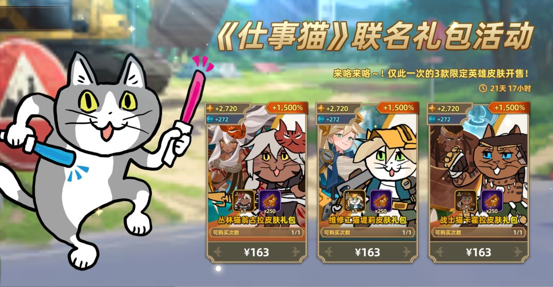 活动期间,购买礼包即可获取【丛林猫翁古拉】、【维修工猫堤莉】、【战士猫卡霍拉】三款联动特色英雄皮肤!
