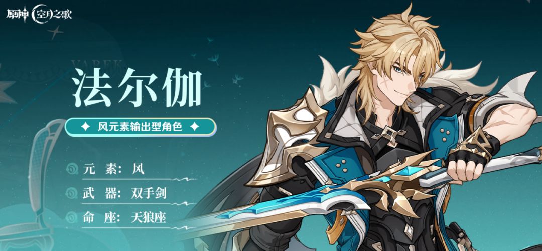 法尔伽是一位持续站场普攻、战技输出的风元素双手剑角色,施放元素战技会进入强化状态,期间普攻、重击和元素战技会获得强化,双持的大剑还会根据队伍中可扩散元素的类型附魔,同时造成双元素伤害,是角色机制的一大亮点。