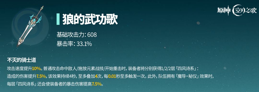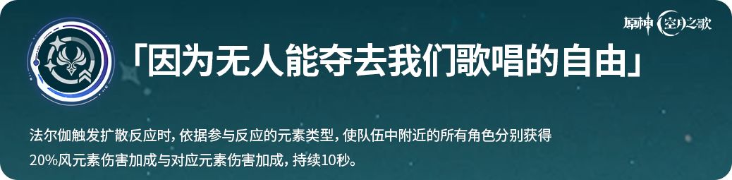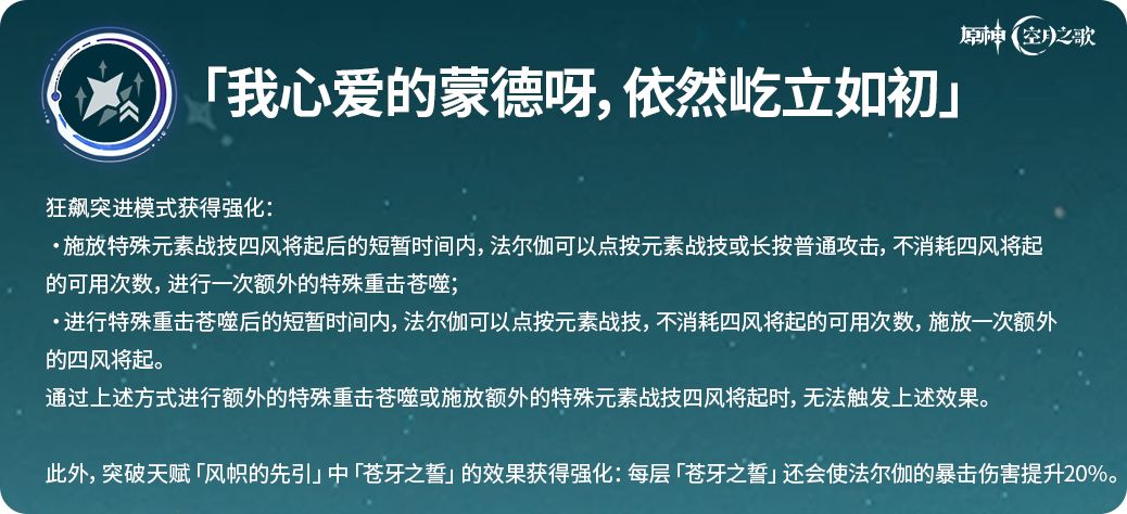 晓风的行军:队伍中存在可扩散元素的队友时,可以获得风伤与对应元素伤害加成,在2500攻击时吃满25%增伤。需要队伍同时存在两名风元素与两名相同的火水雷冰角色才能吃满buff,此时强化状态下的普攻、重击、战技可以造成原本2.2倍的伤害,对法尔伽的配队进行了限制,但换来了非常可观的数值提升。