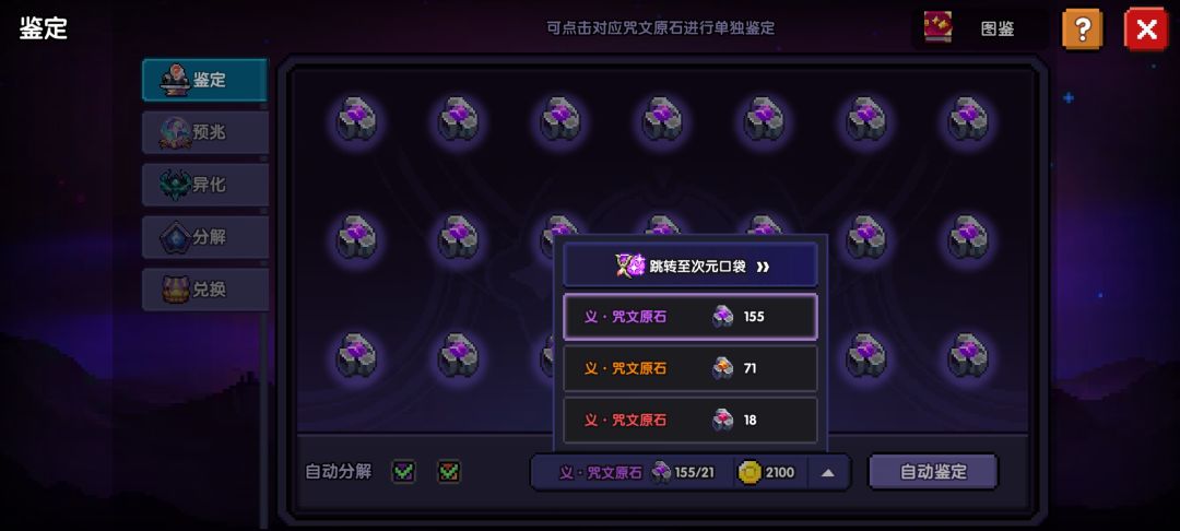 在鉴定页面,紫色和橙色的无脑鉴定就行了,然后把没有神骸的分解了。有神骸但没什么用的,也可以分解了(后文会讲哪些有用)