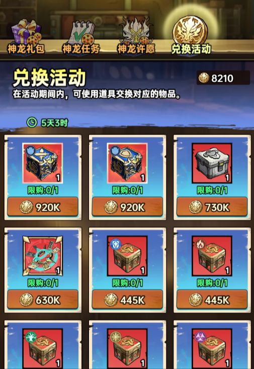 活动期间供奉龙珠获得的神龙币可以在兑换商店进行消耗兑换,其中更有好礼【磐岩玄武装备箱.攻】,【磐岩玄武装备箱.防】,【传说装备套宝箱】等供幸存者者们自由选择兑换~