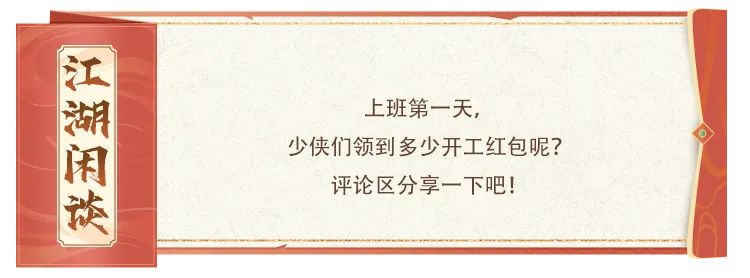 初八开工大吉!少侠们今天都收到开工红包了吗?快来评论区晒一晒你的开年好运,老赵将随机抽取三位幸运儿送上【新年幸运贺礼】CDK!内含100绑定元宝、蓝田玉令、大红福等超值好物,助你江湖之路红红火火!还等什么?赶紧留言参与,说不定幸运儿就是你!