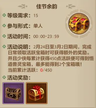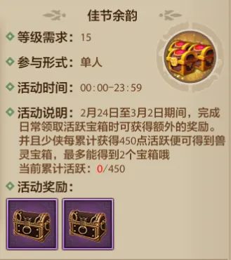 在2月24日-3月2日期间,不管是经典版还是轻松版的少侠,只要完成日常任务领取活跃宝箱时,可额外斩获惊喜奖励,每累计获得450点活跃,即可解锁一份专属好礼。