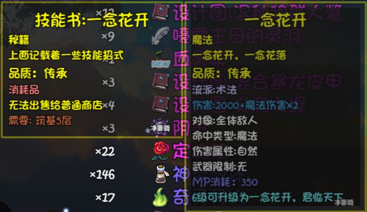 然后就是一念花开,个人认为,如果愿意花时间去刷神妙的话,一念花开对于我们30级版本的舒适度提升很大,前面算过了,净罪打击算上门派被动和配套心法能达到差不多2.9的系数,这里绑定了两个心法槽,而如果有火转神妙,那算上被动,一念能达到4.6的系数,不绑定心法槽。特别要说明,目前30级版本,系数最高的群刷应该是佛门的钟(配合门派套),能达到6.5的对群系数,然后其他的门派群攻都是和净罪差不多的水准,或者说,不如吃了15%独立增伤的净罪打击。在这样的环境下,如果能刷一件火转神妙出来,我们的群攻系数应该是佛门之下第一,而且我们是可以在初入两仪就达成的,因为两仪1-5级的世界掉落里面就有一把适合的法杖,挂一个晚上说不定就出了()