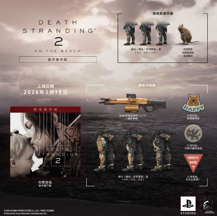 游戏将于2026 年3月19日正式登陆PC平台,国区售价标准版298元、豪华版338元,目前已开启预购。作为小岛工作室备受期待的开放世界大作,PC 版将完整移植主机内容,支持更高画质与更流畅体验。本次信息公布让 PC 玩家可提前准备设备与预购,静待发售开启全新连接之旅。