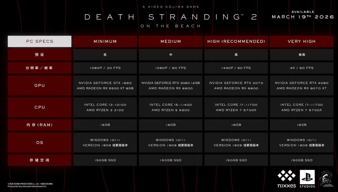 今日,《死亡搁浅2》PC版官方配置需求正式公开。游戏最低要求为GTX 1660/RX 5500 XT显卡,内存需16GB 以上,存储空间要求150GB 固态硬盘。整体配置门槛友好,多数主流电脑均可流畅运行,方便玩家提前准备设备迎接上线。