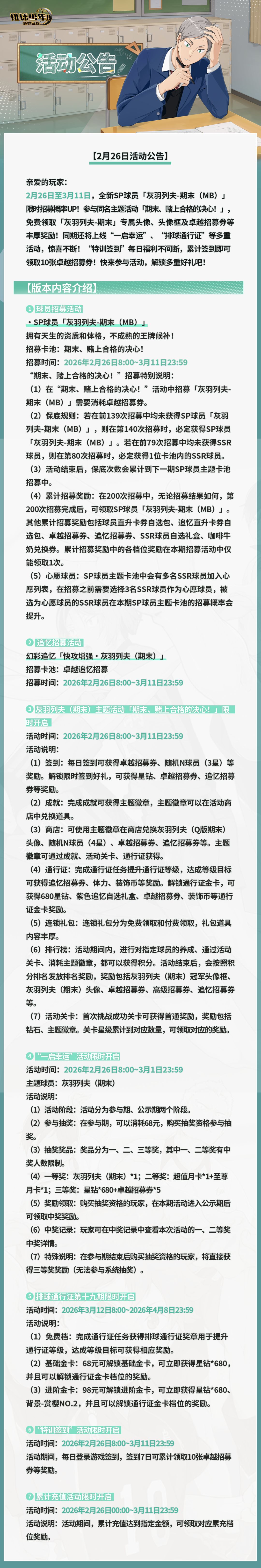 2月26日 ~ 3月11日,全新SP球员「灰羽列夫-期末(MB)」招募概率限时UP!参与同名主题活动「期末、赌上合格的决心!」限时开启,参与可获得灰羽列夫(期末)专属头像、卓越招募券等丰厚奖励!