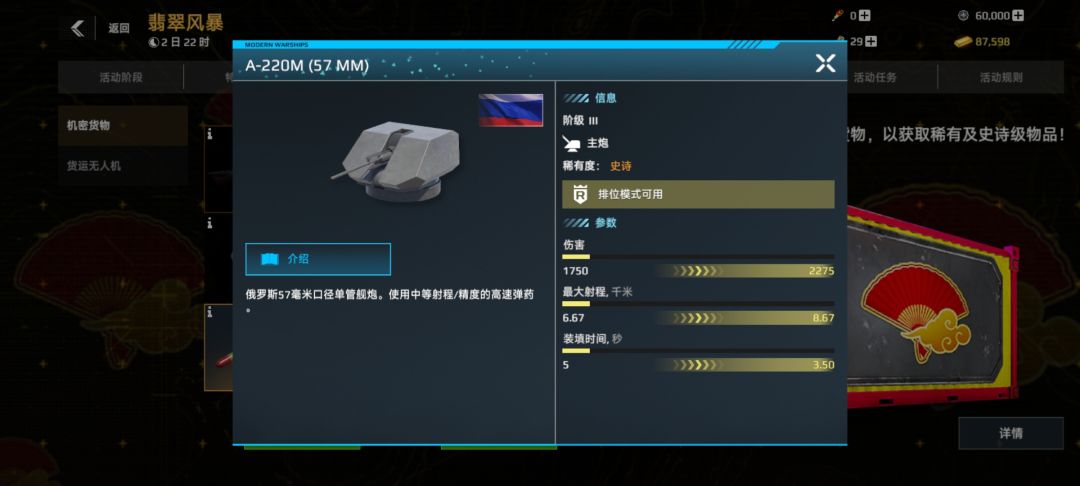 还有是 A22M 的主炮,这个防空主炮的强度还是非常不错的,号称防空主炮界的博福斯,有防空舰的玩家需求可以考虑进行装配。