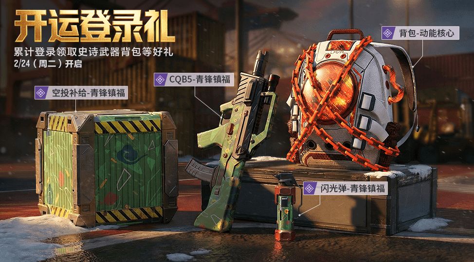 2月24日,开运登录礼已正式上线!战士们累计登录游戏,即可获得史诗级武器CQB5-青锋镇福、闪光弹-青锋镇福、空投补给-青锋镇福、背包-动能核心和福利点券,每日登录都有新惊喜!