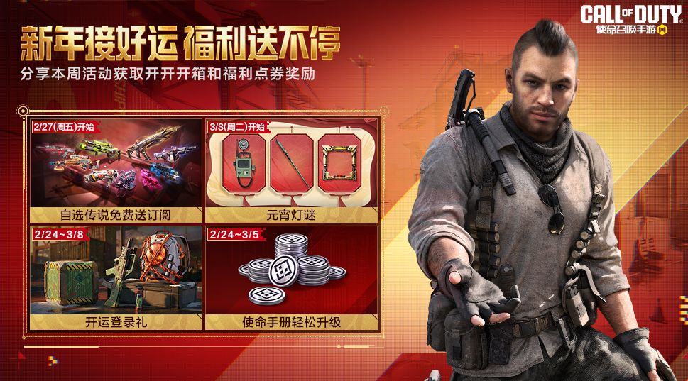 2月28日(本周六),周末对局礼限时开启!战士们参与多人对战或使命战场模式,即可轻松带走福利点券,周末不摸鱼,奖励拿不停!