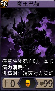 魔王巴赫:30费生物卡,0攻99血。任意生物死亡时,本卡法力消耗-1。进场时:消灭对方英雄。