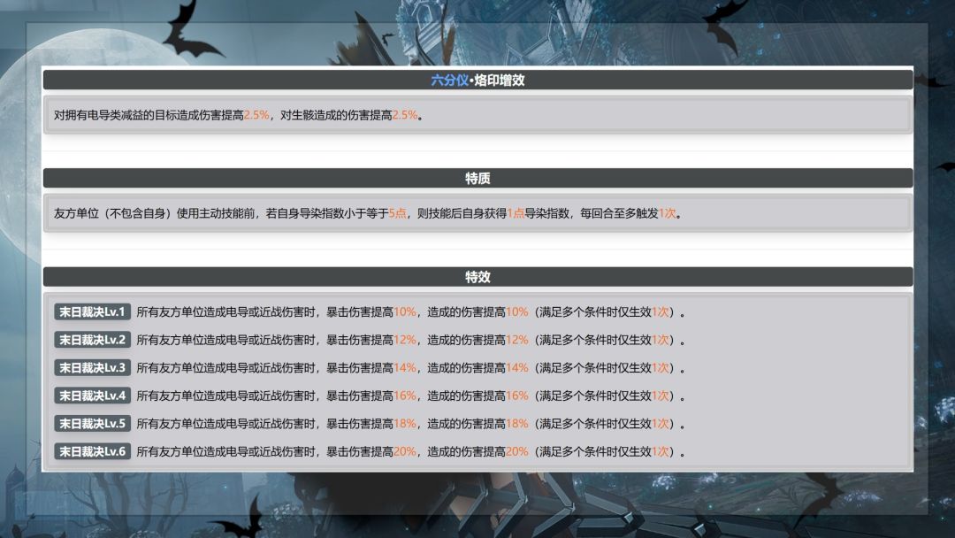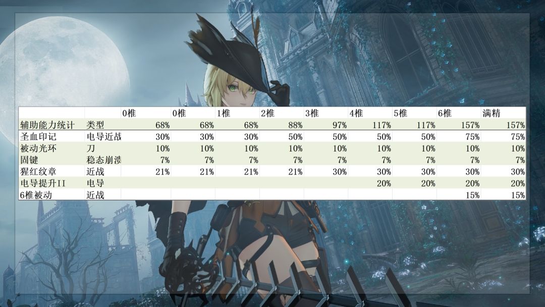 这里直接吧辅助能力整理成一图流提供给大家。可以看到0+0六分仪对于电队的提升就只有圣血印记的30%增伤,和固键稳态崩溃时提供的全队7%增伤。圣血印记都加成在2椎和6椎都有所提升,4椎还会提供【电导提升II】,所以严格来说六分仪的辅助能力6椎才是完全体,对比0椎已经是翻倍不止。当然还有一个热知识,圣血印记提供的额外稳态伤害可以增加莱娅的技能倍率。
