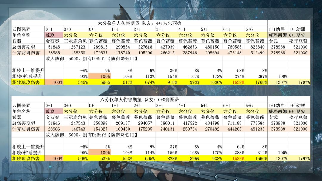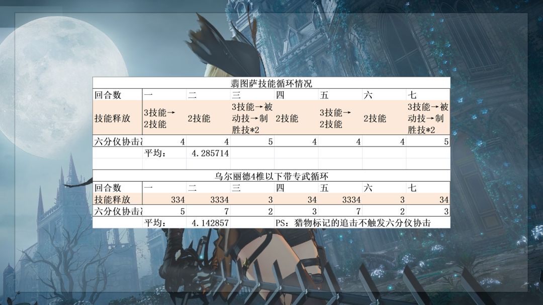 3. 六分仪带4+1乌尔丽德的伤害期望,如果是0+1乌尔丽德的伤害虽然会比翡图萨略低,但是优势在于乌尔丽德不需要任何触发器触发协击,配队更加自由。