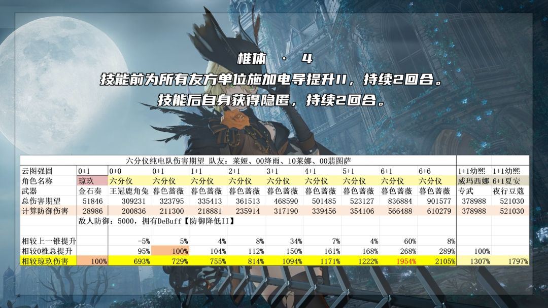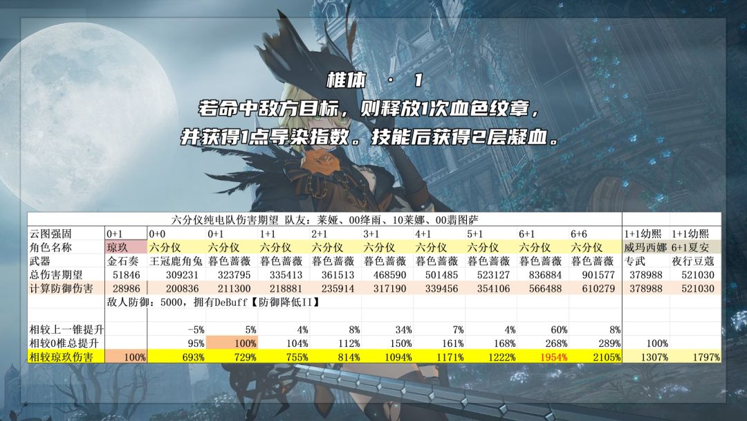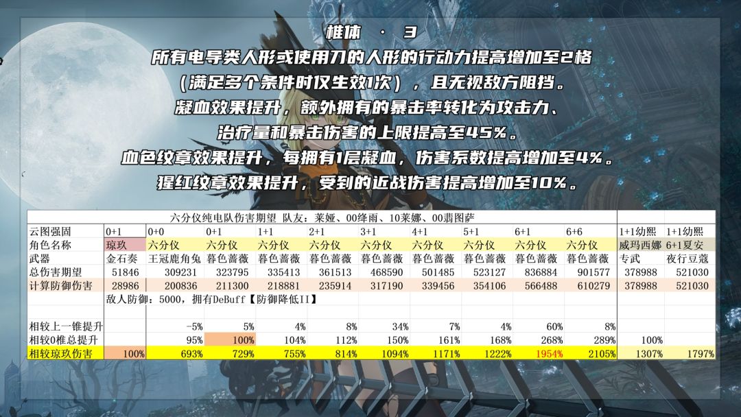 六椎:提升了凝血提供的暴击率上限,等于叠层上限从10层变成15层,但是没有增加暴击的转化上限,依旧是45%。所以这个效果实际就是增加技能倍率,以及圣血印记的全队增伤效果。再次增加被动天雷的倍率,从100%提升到150%,攻击时无视30%防御要分场合,正常情况约等于20%的天雷总伤害提升,但如果是会战这种减防溢出的场合就没有收益了。不消耗导染的效果,等于是让六分仪的协同攻击可以无限次触发,但是第7次以及之后触发就只有30%的倍率了,加上【割裂伤】最多也就是等效51%的倍率。但是可以预见的是,如果未来有纯刀队,六分仪的无限次协击肯定是作为队伍核心必不可少的。六椎在翡图萨电队的提升为60%。