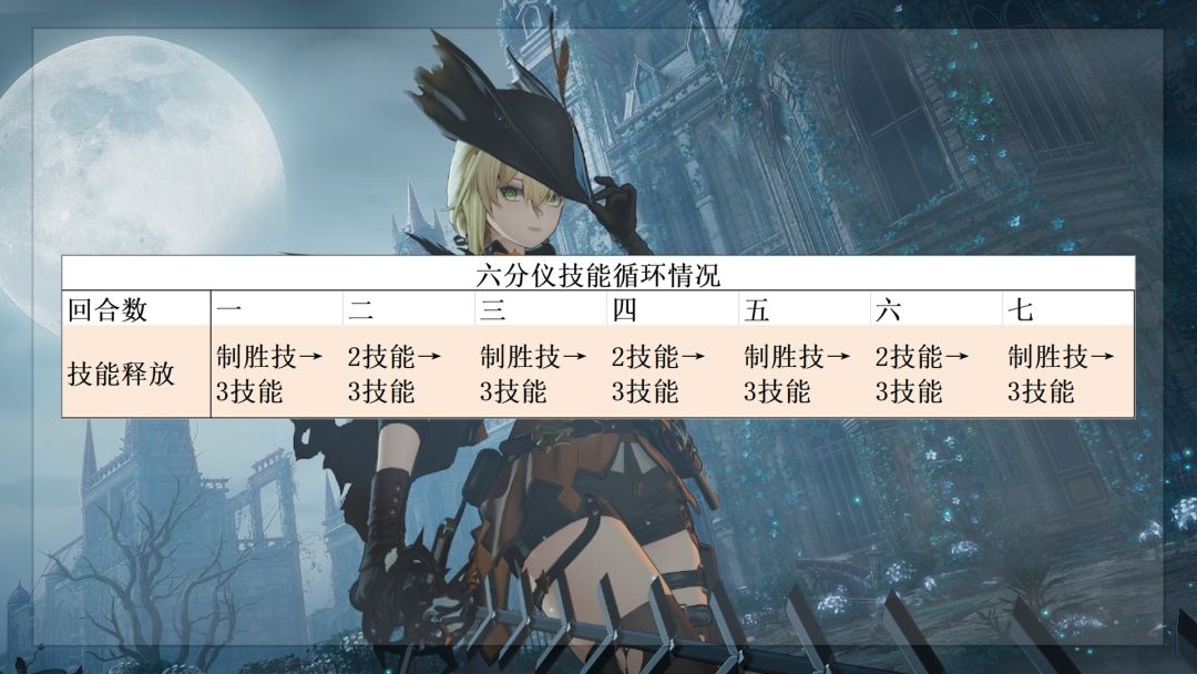 如果乌尔丽德达到4椎,则每回合都可以释放3334技能。因为乌尔丽德的2阶跃键会使3技能造成两次伤害,所以每回合都可以触发7次六分仪协击。六分仪满椎后,协击次数变为无限,但是六椎之前带专武每回合刚好最多是7次协击。